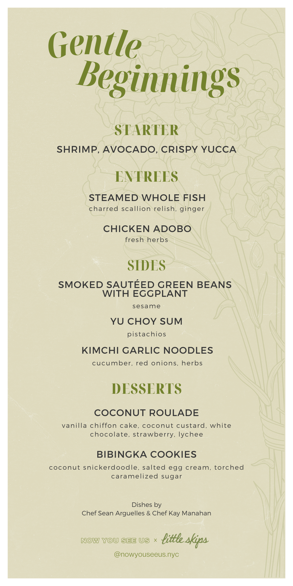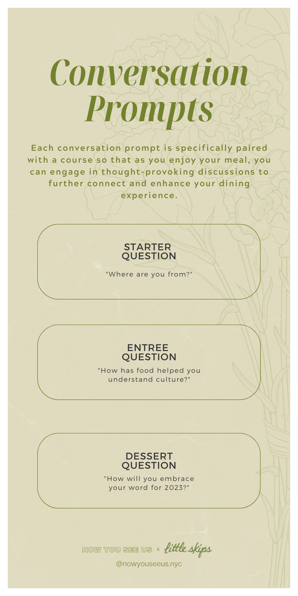 My first project with NYSU was an event celebrating Lunar New Year. I was given words and feelings to help guide with the intention of what this event has to offer. My tasks were to create the overall social design to then translate it over to physical assets that would be printed and used in the event itself. These printed assets included name cards, a double-sided menu that had conversation prompts, and the bar menu.